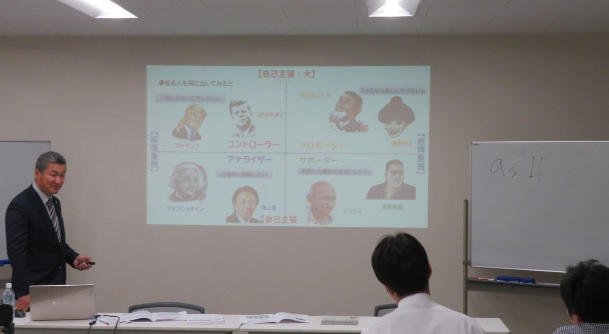 相手と自分自身のしぐさ、口癖、行動志向などから4つのタイプに大別する相手の捉え方と、それぞれのタイプと円滑な対人関係を生み出す対人スキルを学んでいただきました。